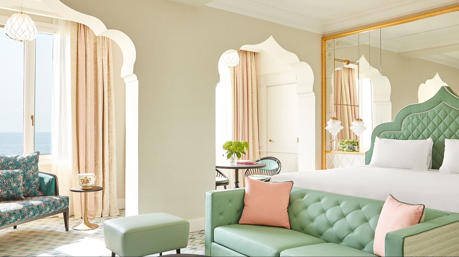 Here’s a perfect moment to pause and admire: A luxurious interior view of one of the pastel-hued junior suites, showcasing Moorish arches, soft seafoam and pink tones, elegant furnishings, and a balcony with sea views.